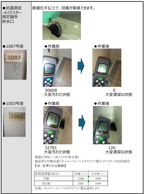 ・このホテルによると、つまり・においのクレームは減少。作業の効果を実感していただけました。※今回の場合は、「古い鉄菅の排水管」への対策により、効果が感じられました。