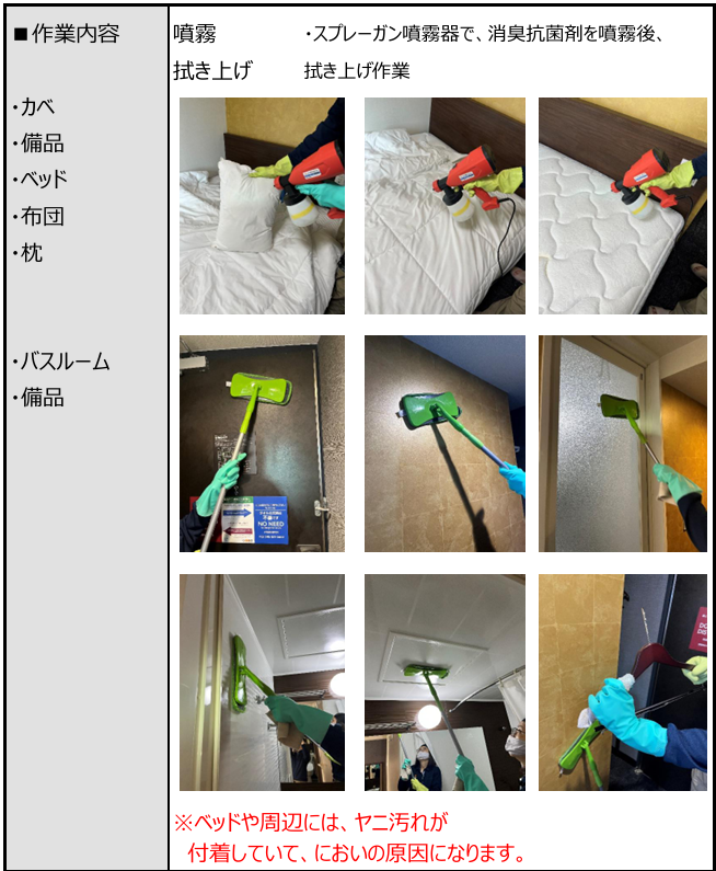 カベをふくだけでは、タバコ臭は消えません。客室内のほぼすべて、カベ紙、天井、床カーペット、デスク、クローゼット、備品類、ベッド、ふとん、まくら、カーテン、バスルーム、空調機・機器内部、天井ウラに至るまで、消臭が必要です。