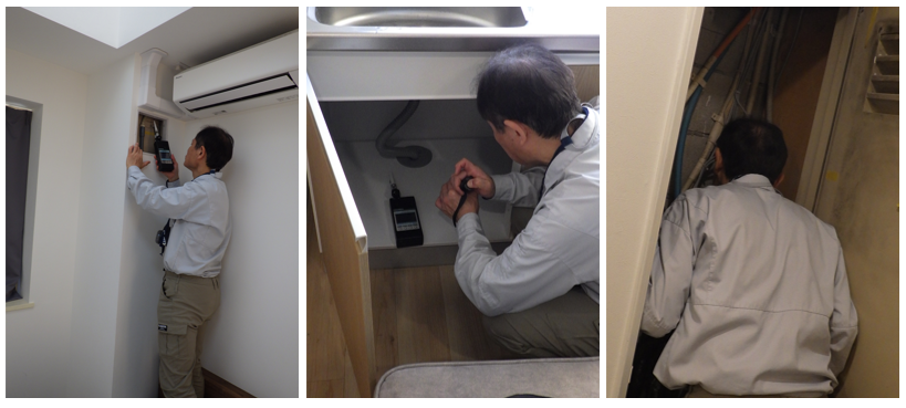 ・においの国家資格・臭気判定士が、においの元を見つけます。※今回の場合は、1か所でなく、洋室、キッチン排水口 、建物内部から「臭気」が発生していて、においが混ざることによって、原因がわからなかったと考えられます。
